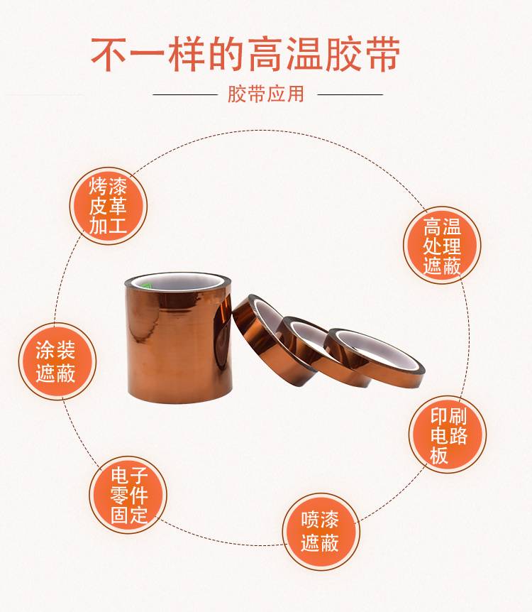 高溫膠帶,即高溫作業環境下使用的膠粘帶。主要用于電子工業用途,耐溫性能通常在120度到260度之間,常用于噴漆、烤漆皮革加工、涂裝遮蔽和電子零件制程中固定、印刷電路板及高溫處理遮蔽。高溫膠帶包括KAPTON高溫膠帶;鐵氟龍高溫膠帶;高溫美紋紙膠帶;PET綠色高溫膠帶;高溫雙面膠等。
